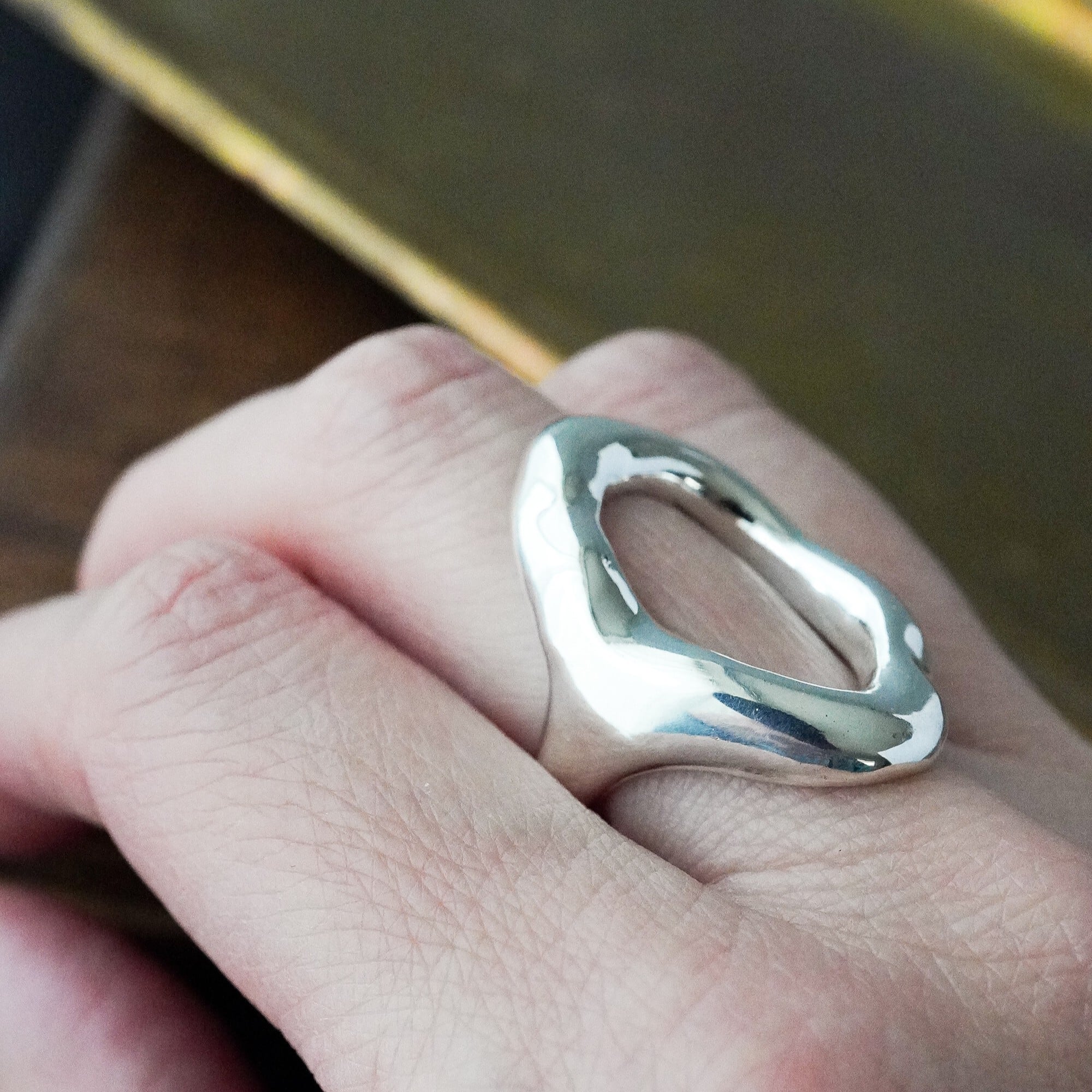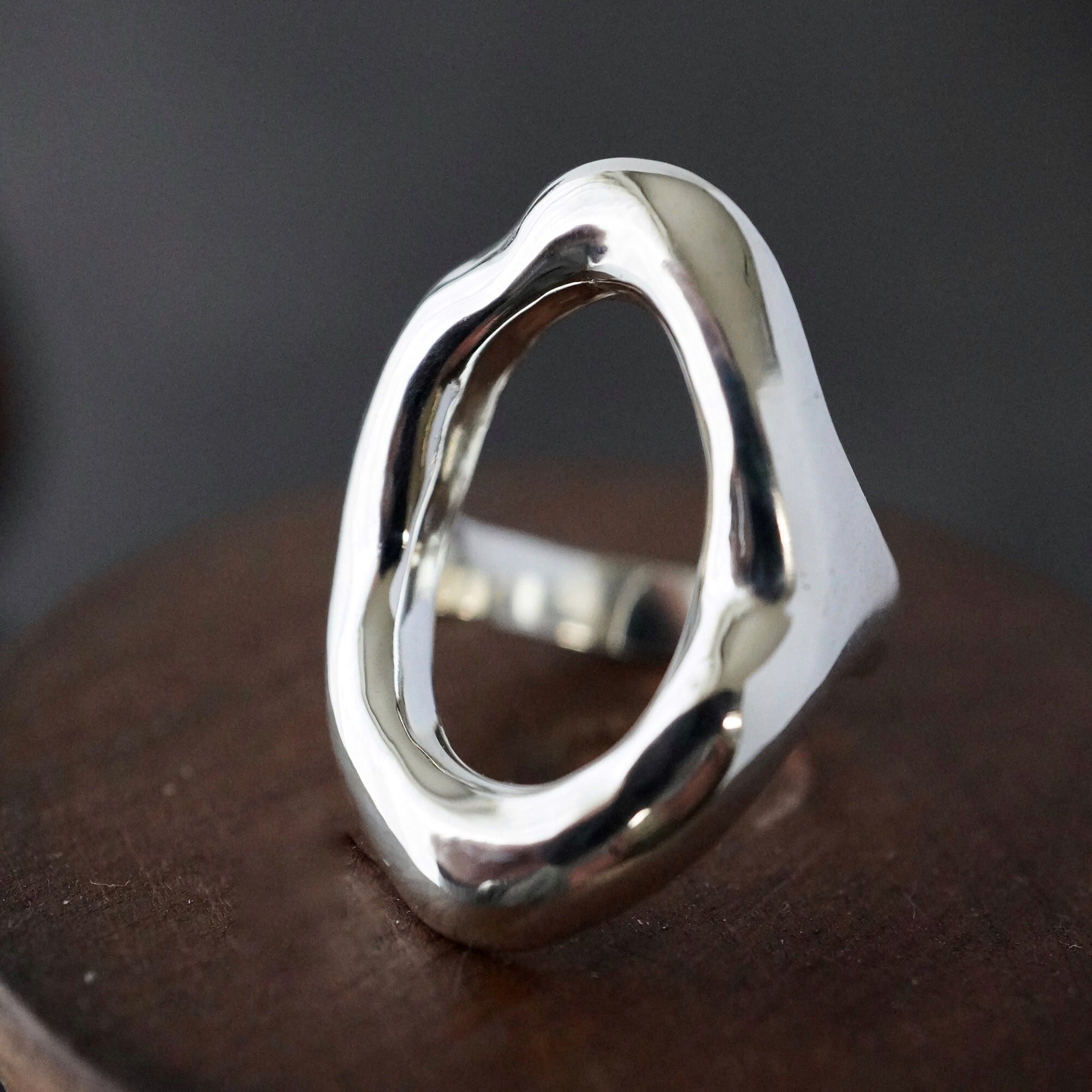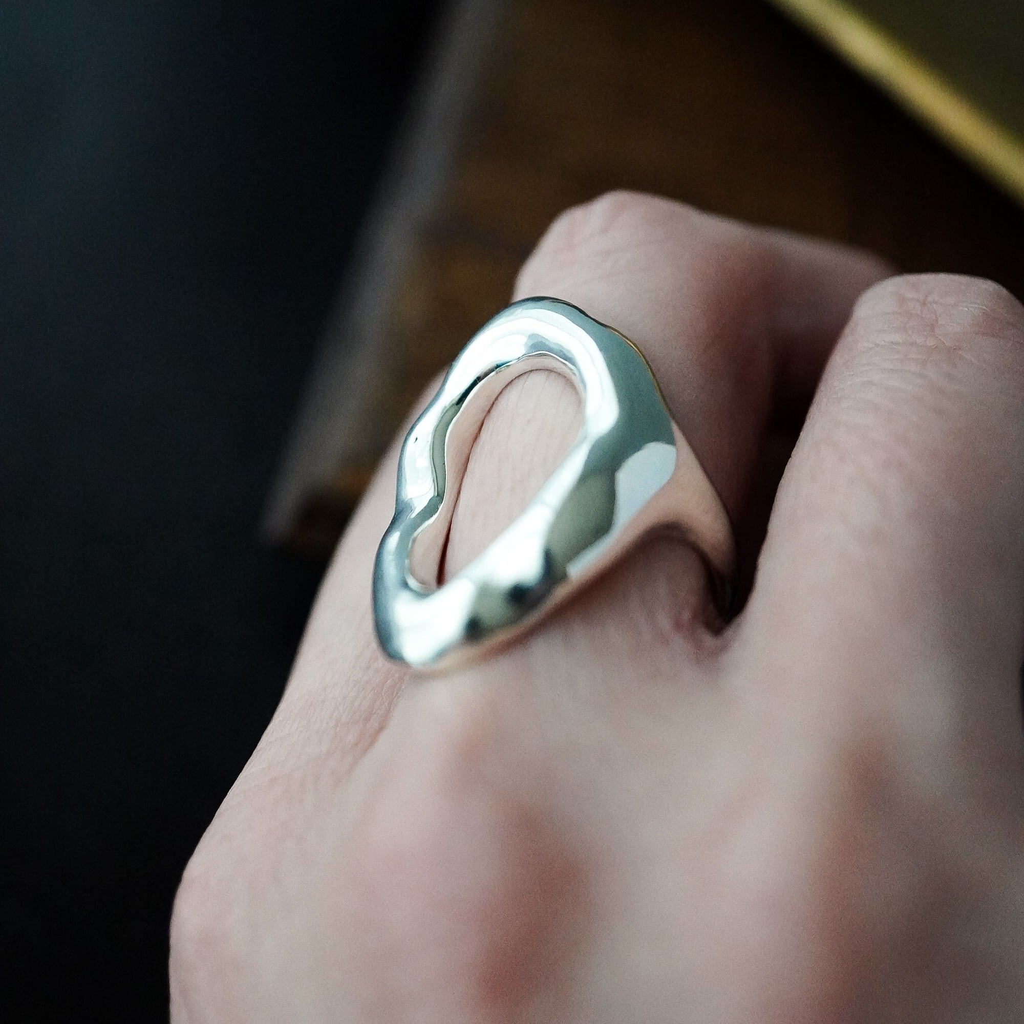 有機的にゆらぐ曲線と、鏡のように磨き上げた艶やかな表情が、指先にやわらかな光を集めます。